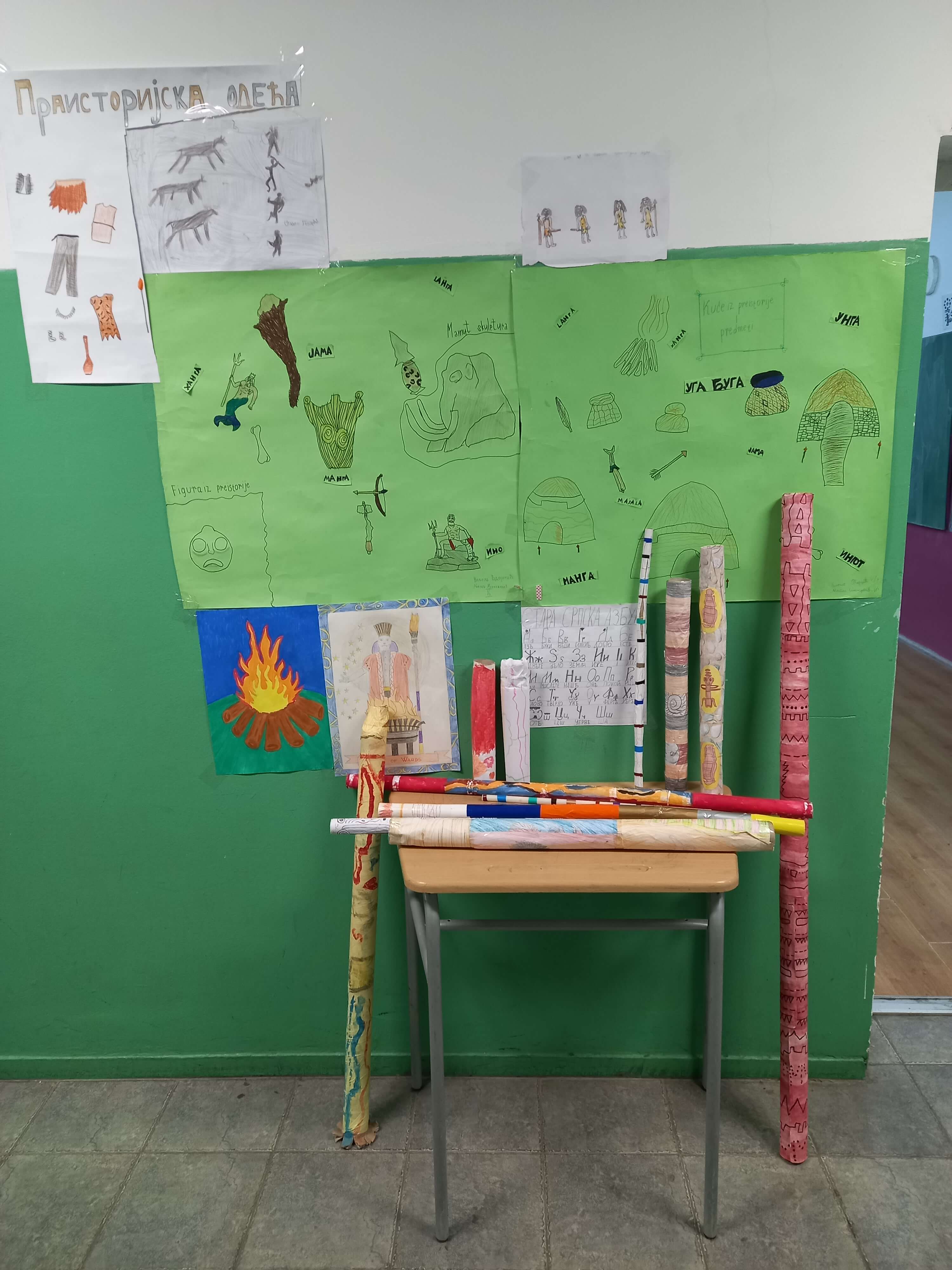 На претходним часовима музичке културе, временском машином вратили смо се у праисторију. Видели смо како се живело и каква се музика слушала у то доба. Ученици одељења V3 својим су радовима показали и осталима шта су научили. Ту је и најстарији инструмент – диђериду. Ученици су сами правили и осликали инструменте. Видећемо у коју ће нас епоху временска капсула следећи пут ,,избацити“.